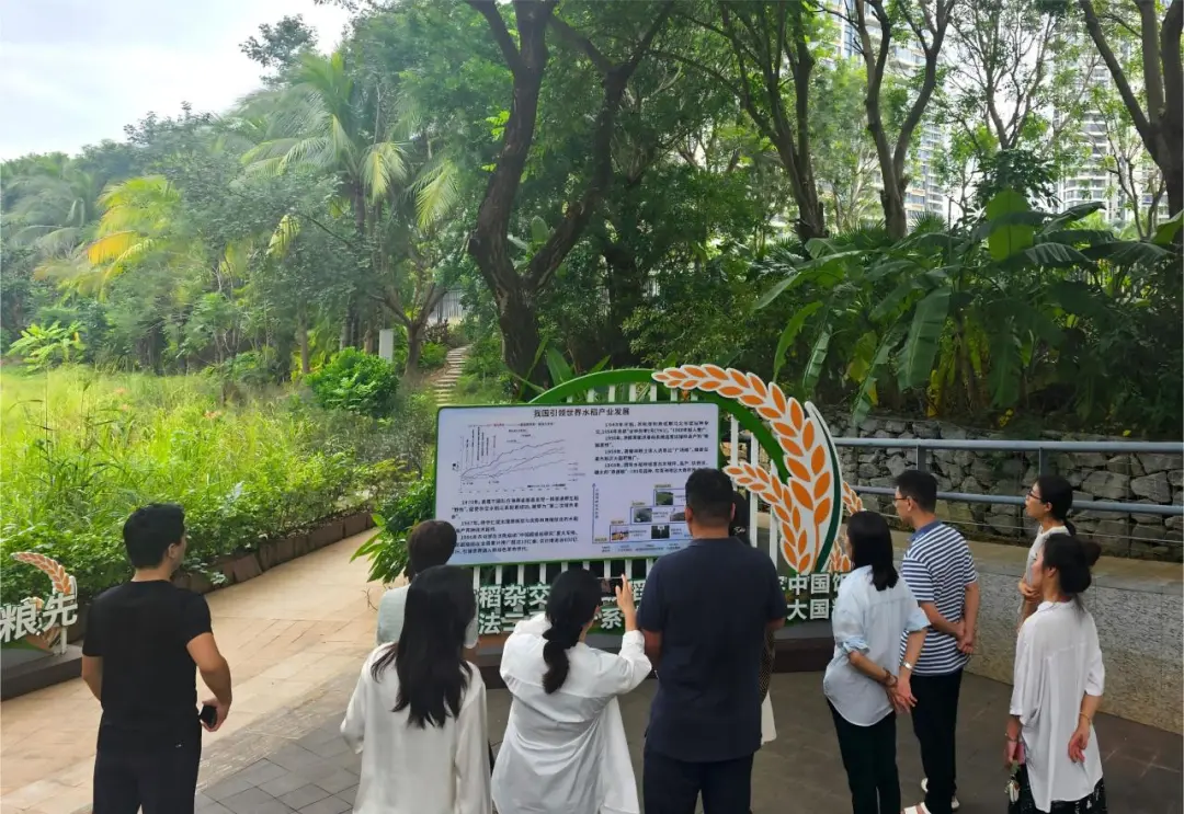同学们在南繁中央公园实验稻田旁驻足。这里是生态绿地,更是南繁精神象征。袁隆平院士曾在此发现“野败”,从而开启了杂交水稻的新篇章。同学们由此体悟到“把论文写在大地上”这一理念的深刻内涵。