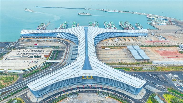其总建筑面积约21.6万平方米,年设计通过旅客3500万人次、车辆560万辆次,集候船、口岸查验、商业和交通“零换乘”等功能于一体,采用“鲲鹏”振翅设计理念。通过人车分流、智能查验及连接全省高速路网,枢纽大幅提升通行效率与旅客体验,带动周边旅游、商业发展,对海口港产城一体化意义重大。