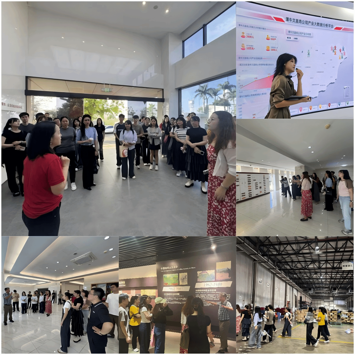 在潭牛文昌鸡基地,学生参观展厅和透明车间,系统了解了品牌发展历程与标准化生产技术;在生猪屠宰厂的自动化生产线和全流程质检体系,学生观摩了“从农场到餐桌”的食品安全管控实践;在力神咖啡,学生深入了解了海南咖啡产业现状及企业的双品牌发展战略;在冷链物流园观摩高效自动化仓储与配送网络,体验了罗牛山在全品类一站式物流服务方面的核心实力。在潭牛文昌鸡基地,学生参观展厅和透明车间,系统了解了品牌发展历程与标准化生产技术;在生猪屠宰厂的自动化生产线和全流程质检体系,学生观摩了“从农场到餐桌”的食品安全管控实践;在力神咖啡,学生深入了解了海南咖啡产业现状及企业的双品牌发展战略;在冷链物流园观摩高效自动化仓储与配送网络,体验了罗牛山在全品类一站式物流服务方面的核心实力。