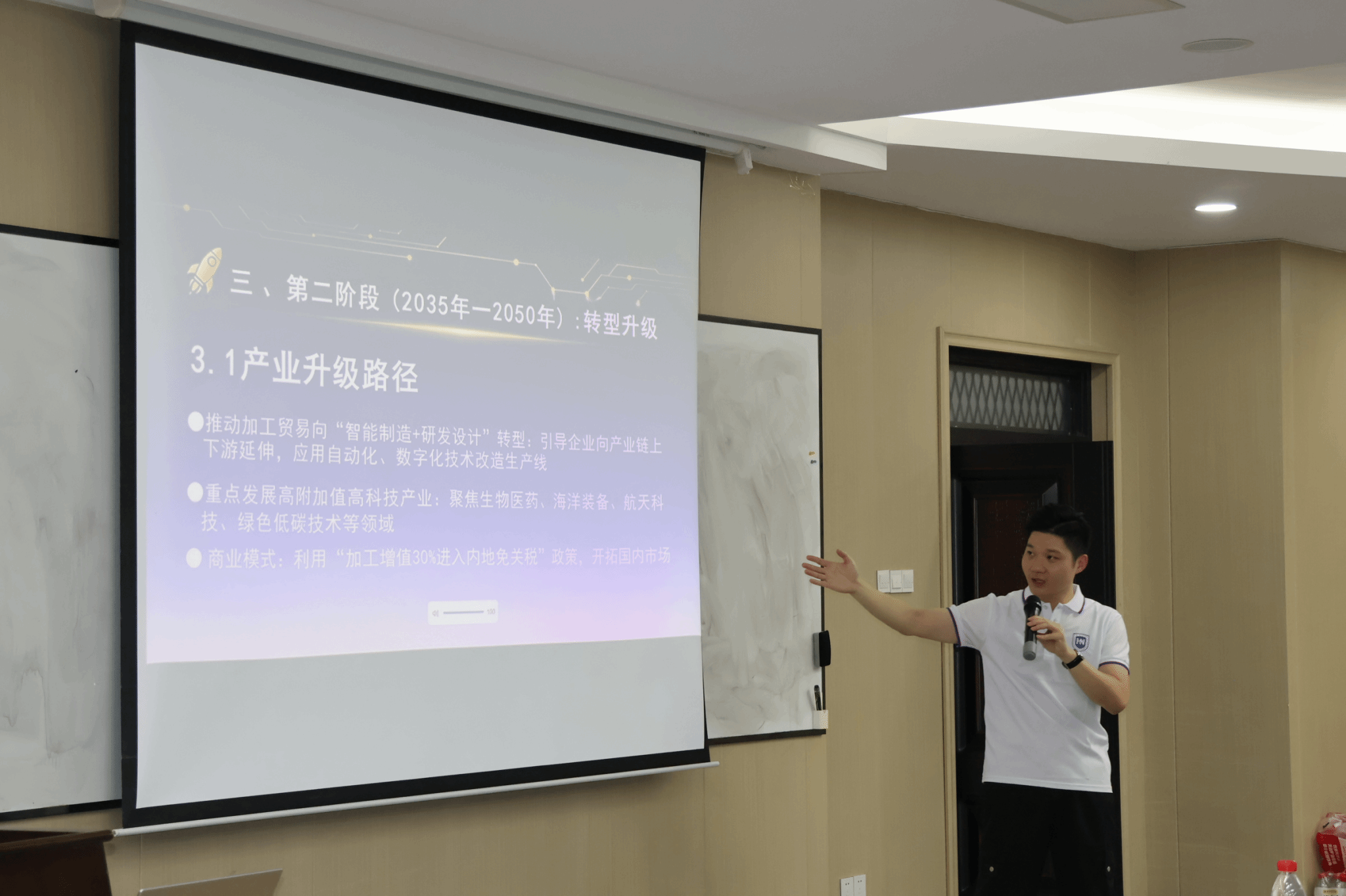 总结会上,一段精彩的游学快剪短片拉开了序幕,带领师生共同回顾了行走中的点滴收获与思考。在成果汇报环节,来自东、西两线的四个优秀小组依次登场,他们围绕参访中的具体案例,深入剖析了自贸港政策下的商业机遇、产业挑战与管理启示,并提出了颇具创见的策略建议,展现了扎实的专业素养与敏锐的商业洞察力。